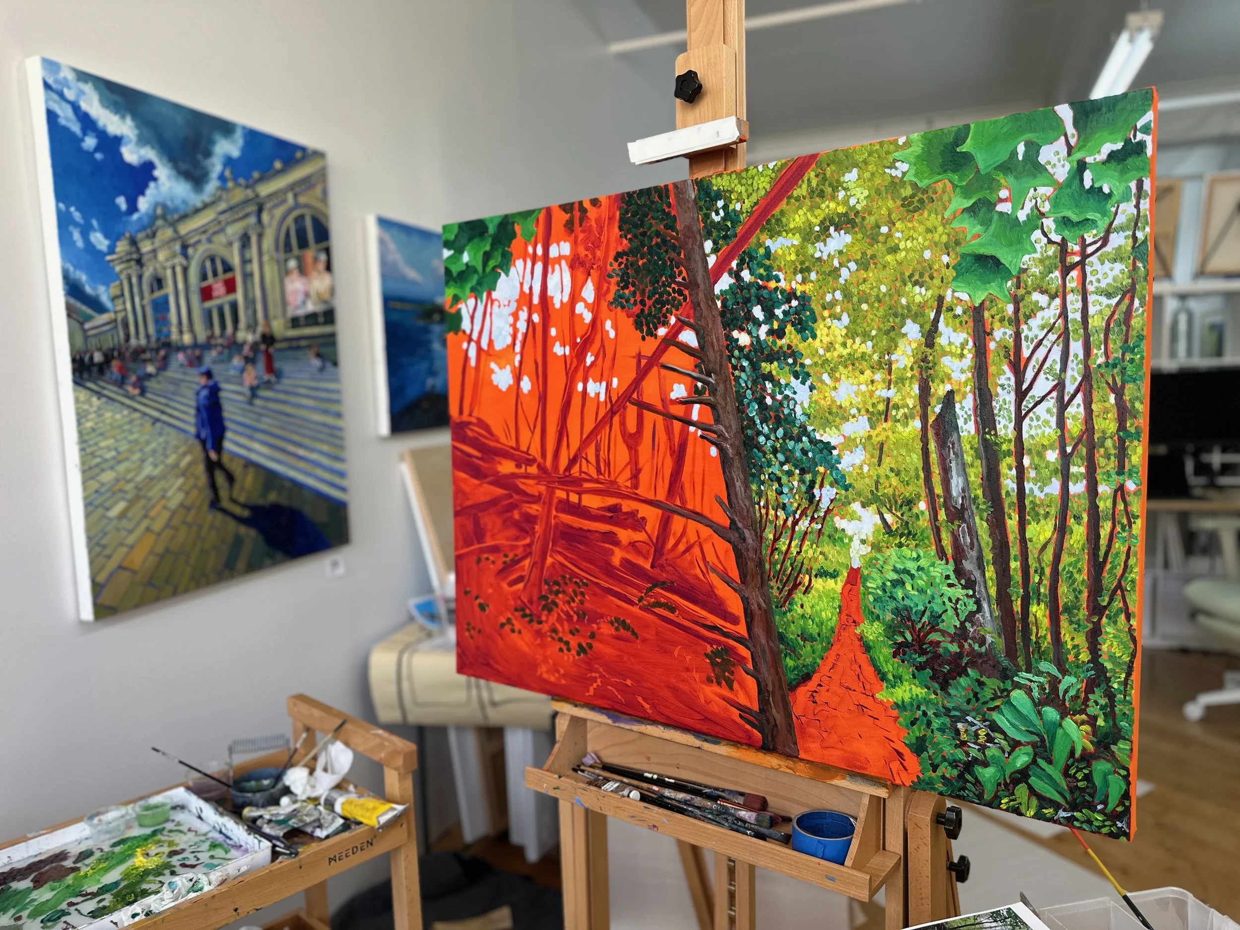 I started with a fast and loose sketch of the scene using thinned out oil paint, trying to capture the expressiveness I am always chasing. Then I slowly built it up layer by layer with thick dots of color, alla prima (wet on wet), a technique where you paint with thick brush strokes of wet on wet oil paint, but in this case I try not to pick up the color underneath. It was exciting seeing the painting come to life, filling up sections of the canvas fully formed.