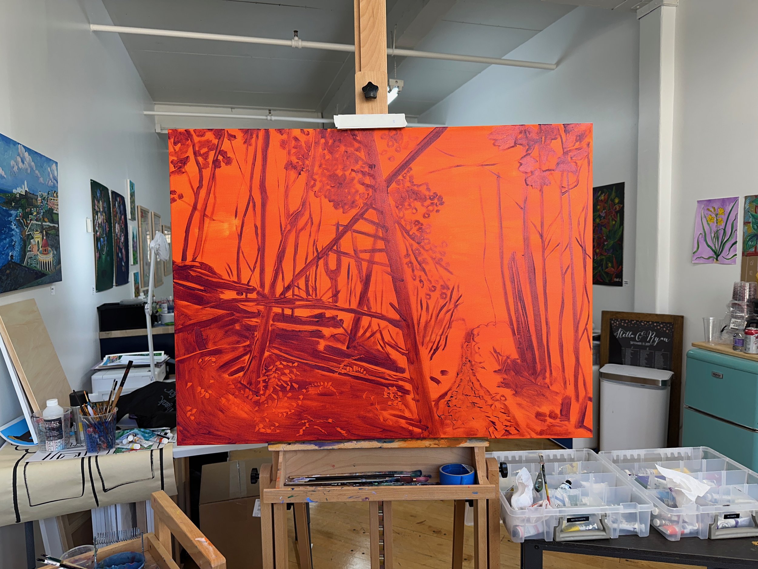 For this piece I had been curious about painting on a violently orange base. I had done hot pink, purple and teal already, while using complementary colors for the painting itself. I was curious if painting a primarily green scene on a hot orange canvas would communicate the heat from that day, when the orange would peek through the cracks in the details.